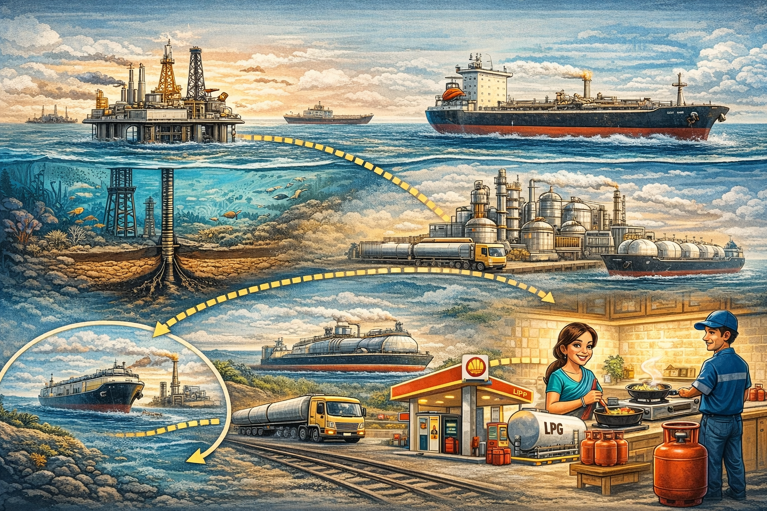 समंदर के तेल कुओं से लेकर आपकी रसोई के एलपीजी सिलेंडर तक ईंधन कैसे पहुंचता है? पाइपलाइन, रिफाइनरी, सुपरटैंकर और होर्मुज जलडमरूमध्य की पूरी कहानी जानिए।