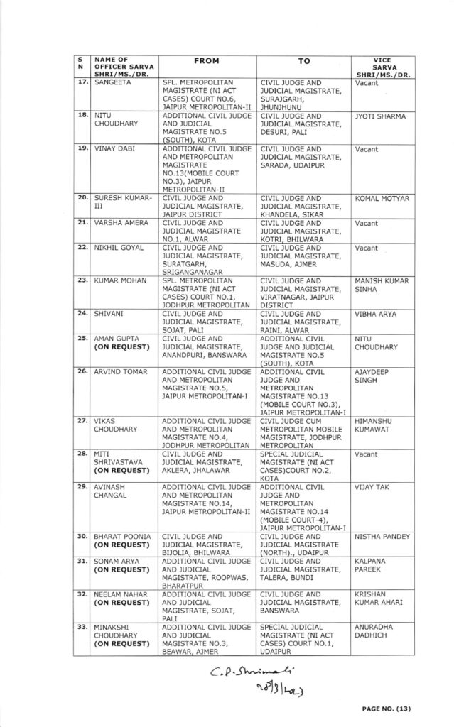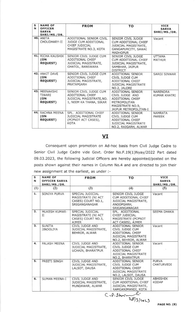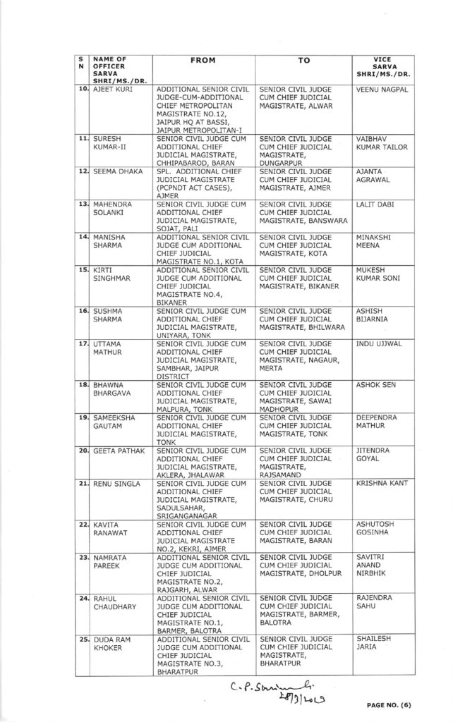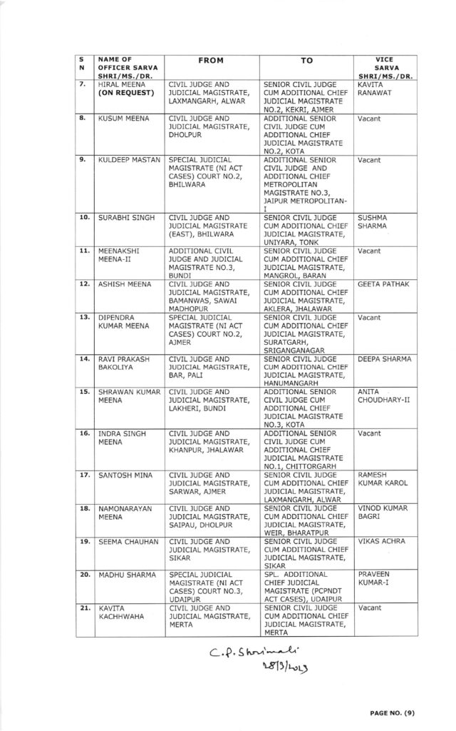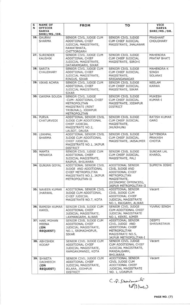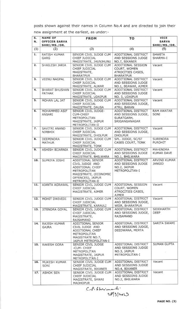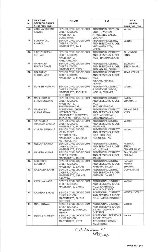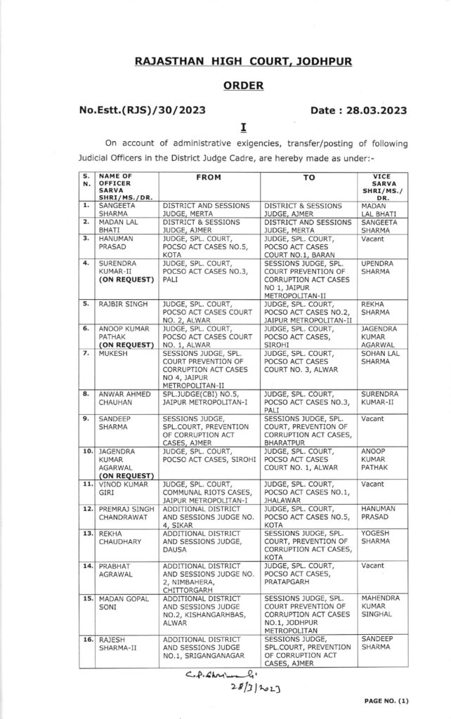 आदेशों के अनुसार मदन गोपाल सोनी को एसीडी केसेज संख्या एक जोधपुर महानगर, विक्रम सांखला को एडीजे संख्या एक जोधपुर महानगर, इंदु उज्ज्वल को एडीजे बिलाड़ा जोधपुर जिला, गरिमा सौदा को वरिष्ठ सिविल जज कम चीफ ज्यूडिशियल मजिस्ट्रेट जोधपुर जिला, प्रतिभा मोटयार को सीनियर सिविल जज कम एडिशनल चीफ ज्यूडिशियल मजिस्ट्रेट रेंट ट्रिब्यूनल जोधपुर महानगर, शाइस्ता लोधी को अतिरिक्त वरिष्ठ सिविल जज कम अतिरिक्त महानगर मजिस्ट्रेट संख्या 8 जोधपुर महानगर एवं विकास चौधरी को सिविल जज कम महानगर मोबाइल मजिस्ट्रेट जोधपुर महानगर के पद पर लगाया गया है। नीचे देखिए पूरी सूची