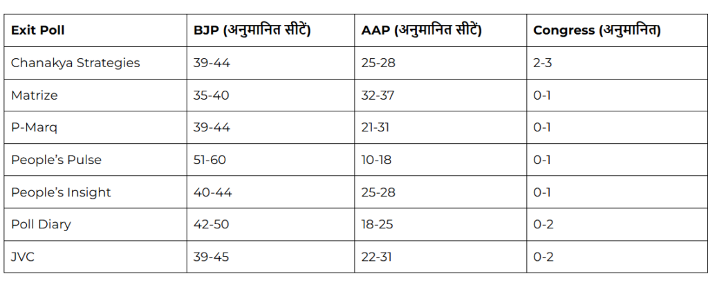 लगभग सभी एग्जिट पोल्स ने दिल्ली की सत्ता में बड़े उलटफेर का अनुमान लगाया है। खासतौर पर MATRIZE, चाणक्य स्ट्रैटजी, पोल डायरी और P-Marq जैसे प्रतिष्ठित सर्वे बता रहे हैं कि बीजेपी पहली बार बहुमत का आंकड़ा पार कर सकती है।