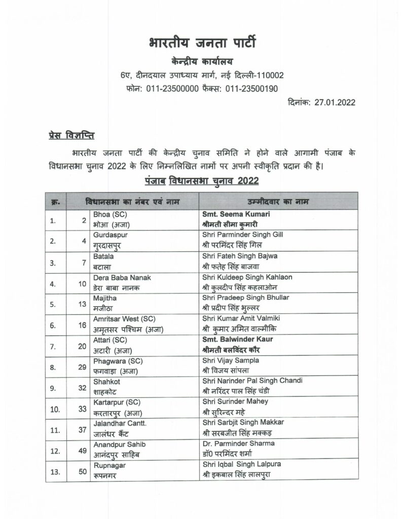 पंजाब में विधानसभा चुनाव को लेकर भाजपा ने अपने 27 और उम्मीदवारों के एक लिस्ट और जारी कर दी है। नई लिस्ट में पूर्व केंद्रीय मंत्री विजय सांपला का नाम भी शामिल है। विजय सांपला फगवाड़ा विधानसभा सीट से चुनाव लड़ेंगे वहीं राष्ट्रीय अल्पसंख्यक आयोग के अध्यक्ष इकबाल सिंह लालपुरा रूपनगर से चुनाव लड़ेंगे। भाजपा एक लिस्ट पहले ही जारी कर चुकी है।