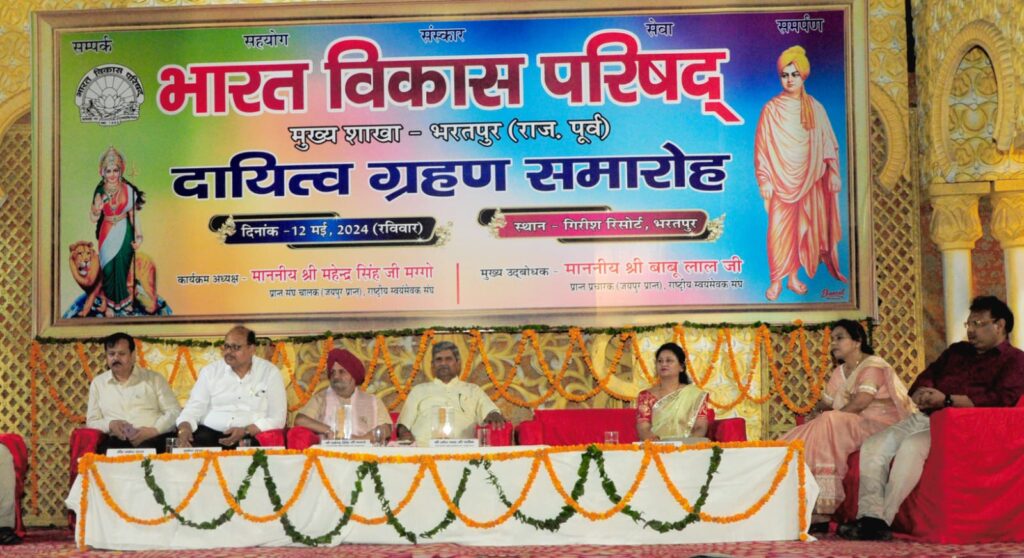 भारत विकास परिषद भरतपुर मुख्य शाखा की सत्र 2024-25 की नवीन कार्यकारिणी का दायित्व ग्रहण समारोह स्थानीय गिरीश रिसोर्ट काली की बगीची पर राष्ट्रीय स्वयंसेवक संघ के जयपुर प्रांत संघचालक महेंद्र सिंह मग्गो की अध्यक्षता में आयोजित हुआ।