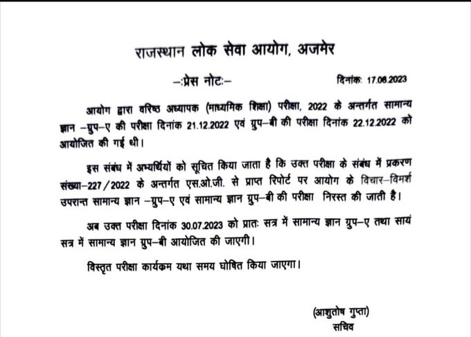 सीनियर टीचर भर्ती पेपर लीक मामले में अब RPSC ने वरिष्ठ अध्यापक (माध्यमिक शिक्षा विभाग) परीक्षा-2022 के अन्तर्गत ग्रुप-ए तथा ग्रुप-बी सामान्य ज्ञान विषय की परीक्षाओं को रद्द कर दिया है। यह परीक्षा अब 30 जुलाई को होगी। आयोग ने एसओजी की रिपोर्ट के आधार पर यह फैसला किया है।