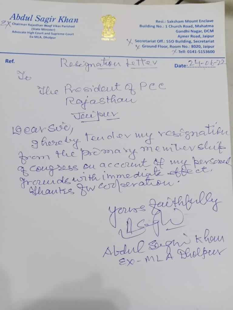 धौलपुर के पूर्व विधायक एवं वक्फ विकास परिषद के पूर्व अध्यक्ष अब्दुल सगीर खान ने कांग्रेस से इस्तीफा दे दिया है। सगीर ने PCC अध्यक्ष गोविंद सिंह डोटासरा को भेजे इस्तीफे में इसकी वजह निजी बताई है, लेकिन सूत्र उनके भाजपा में जाने की अटकलें लगा रहे हैं।