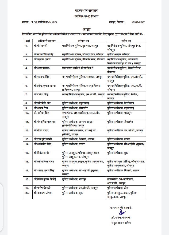 पी रामजी को पुलिस महानिरीक्षक जोधपुर, नवज्योति गोगोई को पुलिस आयुक्त जोधपुर , प्रफुल्ल कुमार को पुलिस महानिरीक्षक आतंकवाद निरोधक दस्ता एटीएस जयपुर , ओमप्रकाश प्रथम को महानिरीक्षक पुलिस बीकानेर , सत्येंद्र सिंह को उप महानिरीक्षक पुलिस एसओजी जयपुर के पद पर लगाया गया है।