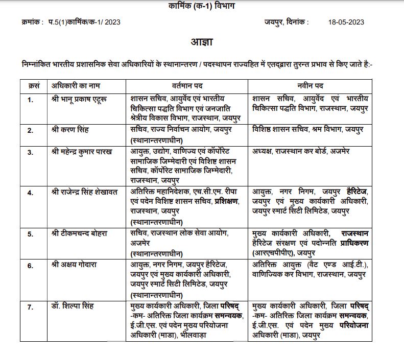 आईएएस हरजीलाल अटल को विशेषाधिकारी सांचौर से स्थानांतरित कर विशेषाधिकारी नीमकाथाना और आईएएस कल्पना अग्रवाल को निदेशक राज्य बीमा एवं प्रावधाई निधि विभाग से स्थानांतरित कर विशेषाधिकारी अनूपगढ़ लगाया गया है। जबकि आईएएस पूजा कुमारी पार्थ को विशेषाधिकारी नीमकाथाना से स्थानांतरित कर विशेष अधिकारी सांचौर और आईएएस सीताराम जाट को विशेष अधिकारी अनूपगढ़ से स्थानांतरित कर विशेष अधिकारी डीडवाना कुचामन लगाया गया है। नीचे देखें तबादला आदेश: