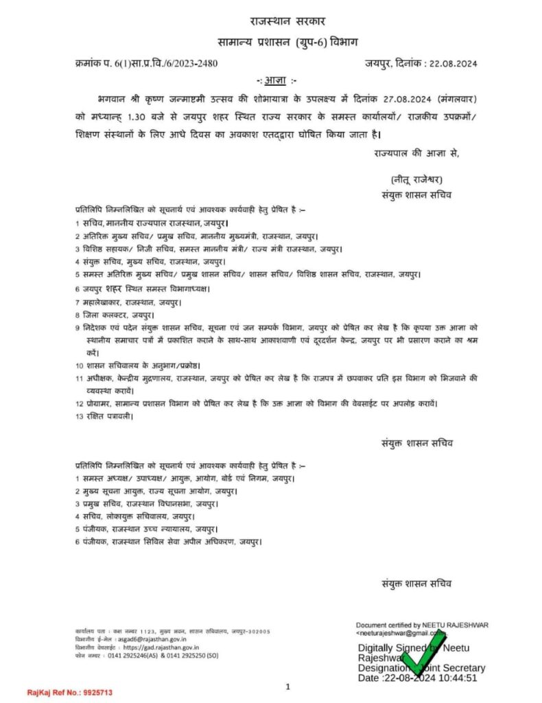 सामान्य प्रशासन विभाग की संयुक्त सचिव नीतू राजेश्वर की ओर से जारी आदेश में कहा गया कि भगवान श्री कृष्ण जन्माष्टमी उत्सव की शोभायात्रा के उपलक्ष्य में 27 अगस्त मंगलवार को दोपहर 1.30 बजे से जयपुर शहर स्थित राज्य सरकार के समस्त कार्यालयों, राजकीय उपक्रमों, शिक्षण संस्थानों में आधे दिन का अवकाश रहेगा। श्री कृष्ण जन्माष्टमी उत्सव को लेकर आधे दिन की छुट्टी का प्रस्ताव पिछले दिनों सामान्य प्रशासन विभाग की ओर से सीएमओ काे भेजा था, जिसकी मुख्यमंत्री भजनलाल शर्मा ने बुधवार देर रात मंजूरी जारी कर दी थी।