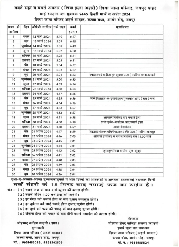 रमज़ान का वास्तविक दिन हर साल बदलता रहता है क्योंकि यह चंद्र कैलेंडर का पालन करता है। मुस्लिम समाज सूर्योदय से सूर्यास्त तक उपवास करके महीने भर चलने वाले रमज़ान पालन करती है। उन व्यक्तियों को छोड़कर जो बीमारी, गर्भावस्था या अन्य कारणों से उपवास करने में असमर्थ हैं, मुसलमान इस अवधि के दौरान खाने, पीने और अन्य शारीरिक आवश्यकताओं को प्राप्त करने से बचते हैं। नीचे जानिए जयपुर का रमजान कलेण्डर: