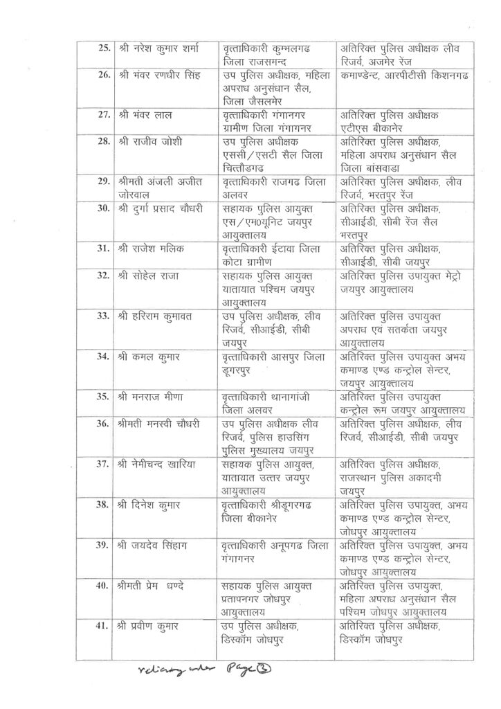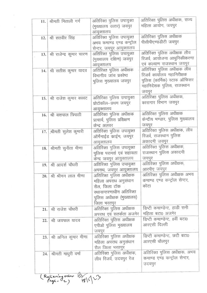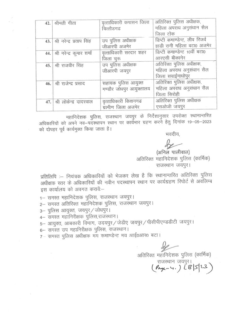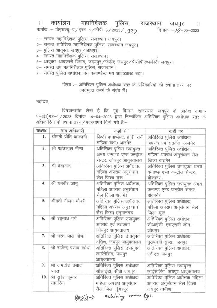 कार्यमुक्त करने के आदेश आज अतिरिक्त पुलिस महानिदेशक (कार्मिक) अनिल पालीवाल के हस्ताक्षरों से जरी किए गए। स्थानांतरित किए गए सभी पुलिस अधिकारियों को अपने नवीन पद के लिए 19 मई दोपहर तक कार्यमुक्त करने के निर्देश दिए गए हैं। नीचे देखें तबादला सूची: