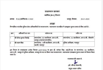 बुधवार को दोबारा दो IPS अफसरों की अलग से तबादला सूची जारी की गई जिसमें भरतपुर SP लगाए गए RAC जयपुर पांचवीं बटालियन के कमांडेंट डा. रामेश्वर सिंह का तबादला निरस्त कर उन्हें पूर्ववत रखने के आदेश जारी कर दिए गए और RAC 14 वीं बटालियन पहाड़ी, भरतपुर के कमांडेंट श्याम सिंह को भरतपुर का नया एसपी नियुक्त कर दिया गया। बताया जाता है कि RSS के नजदीकियों के चलते डा. रामेश्वर सिंह का तबादला निरस्त कर उन्हें पूर्ववत नियुक्त करने के आदेश जारी किए गए।