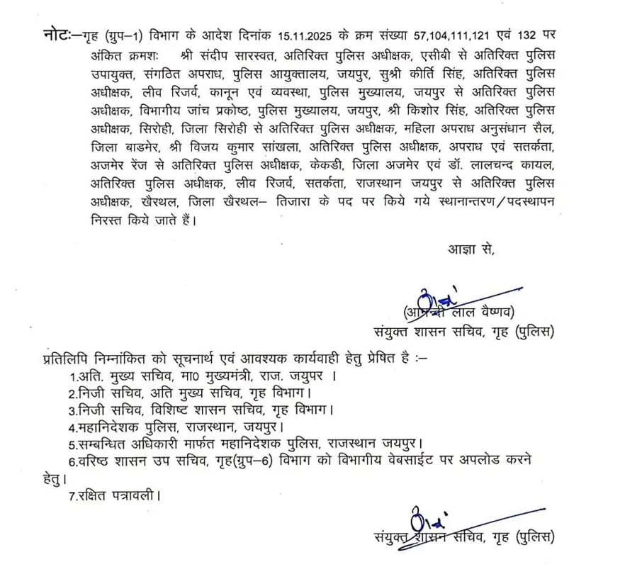 राजस्थान सरकार के गृह (ग्रुप-1) विभाग ने एक अहम निर्णय लेते हुए उन पांच अतिरिक्त पुलिस अधीक्षकों (ASP) के तबादले निरस्त कर दिए हैं, जिन्हें 15 नवंबर 2025 के आदेश के तहत नई तैनाती दी गई थी। शुक्रवार देर रात जारी नोट में विभाग ने साफ कर दिया कि ये सभी स्थानांतरण अब रद्द माने जाएंगे और अधिकारी अपने पूर्व पदस्थापन पर ही कार्यरत रहेंगे।