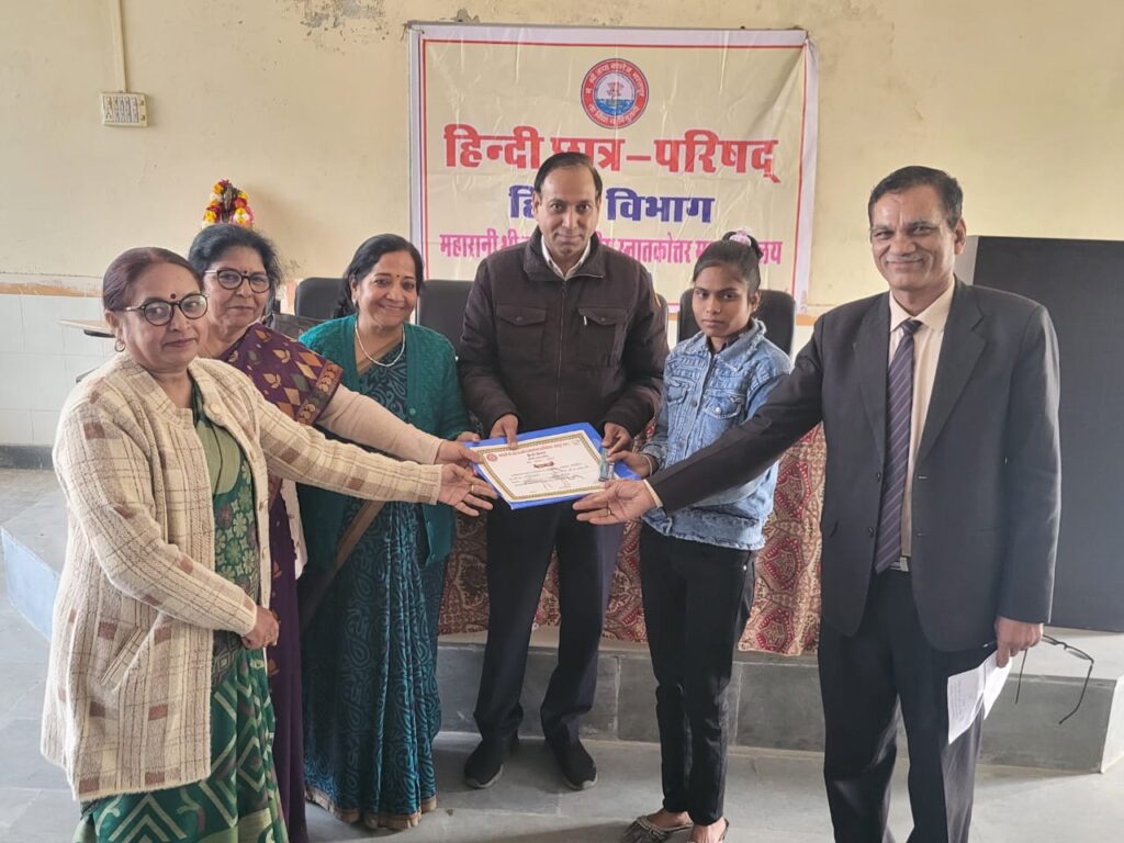 कार्यक्रम में डॉ.नरेश चन्द गोयल, डॉ.अंजना शर्मा, डॉ.बालकृष्ण शर्मा ने अतिथियों का माल्यार्पण कर स्वागत किया। इस अवसर पर पूर्व में हुए निबंध एवं शुद्ध लेखन प्रतियोगिता के विजेताओं को पुरस्कृत किया गया। जिनमें क्रमशः बीए पार्ट प्रथम की ज्योति को प्रथम स्थान, शिवानी त्यागी को द्वितीय  तथा रितिका को तृतीय स्थान इसी तरह हर्ष गर्ग को प्रथम, रागिनी को द्वितीय तथा नम्रता रानी एवं पायल गहलोत को तृतीय स्थान मिलने पर पुरस्कृत किया गया। कार्यक्रम का सफल संचालन डॉ.अशोक कुमार गुप्ता ने किया एवं अंत में  आभार विभागाध्यक्ष डॉ.इला मिश्रा ने किया। कार्यक्रम में डॉ.रामबाबू गुर्जर आदि संकाय सदस्यों के साथ बहु संख्या में विद्यार्थीगण मौजूद थे।