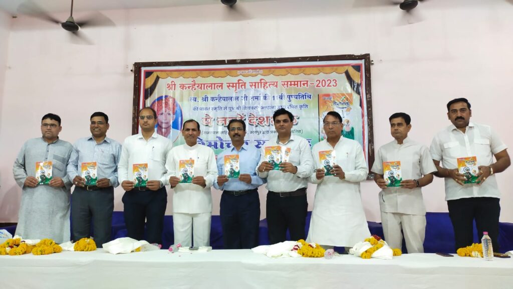 दौसा में आयोजित एक भव्य साहित्य एवं कवि संगम समारोह में जिले के वरिष्ठ साहित्यकार शिवचरण भंडाना की राजस्थान साहित्य अकादमी, उदयपुर के आर्थिक सहयोग एवं राष्ट्रीय कवि चौपाल प्रकाशन, बीकानेर द्वारा प्रकाशित की गई पुस्तक ‘ये नन्हे देशभक्त’ का विमोचन साहित्यकार एवं भारतीय प्रशासनिक सेवा अधिकारी टी. सी. बोहरा, उप जिला कलेक्टर संजय गौरा, राजस्थान धरोहर प्राधिकरण के डायरेक्टर मनोहर लाल गुप्ता, राष्ट्रीय कवि चौपाल के राष्ट्रीय अध्यक्ष कासिम बीकानेरी, आकाशवाणी उद्घोषक शंकर पुरोहित, राजस्थान बाल साहित्य अकादमी के बोर्ड मेंबर डॉक्टर अंजीव अंजुम एवं वरिष्ठ पत्रकार राजेंद्र जैमन के कर कमलों द्वारा किया गया।
