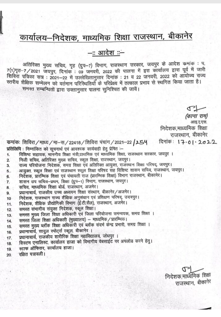 आपको बता दें इस बार राज्य स्तरीय शैक्षिक सम्मेलन 21 व 22 जनवरी को आयोजित होने वाले थे। अब कोरोना संक्रमण के चलते शिक्षा निदेशक कानाराम ने इन सम्मेलनों को स्थगित करने के आदेश दिए हैं। निदेशक में बताया कि राज्य सरकार के गृह कार्य विभाग के दिशा निर्देशानुसार प्रदेश में कोरोना संक्रमण काल की स्थिति को ध्यान में रखते हुए 21 और 22 जनवरी को होने वाले राज्य स्तरीय शैक्षिक सम्मेलन को फिलहाल स्थगित किया जाता है।