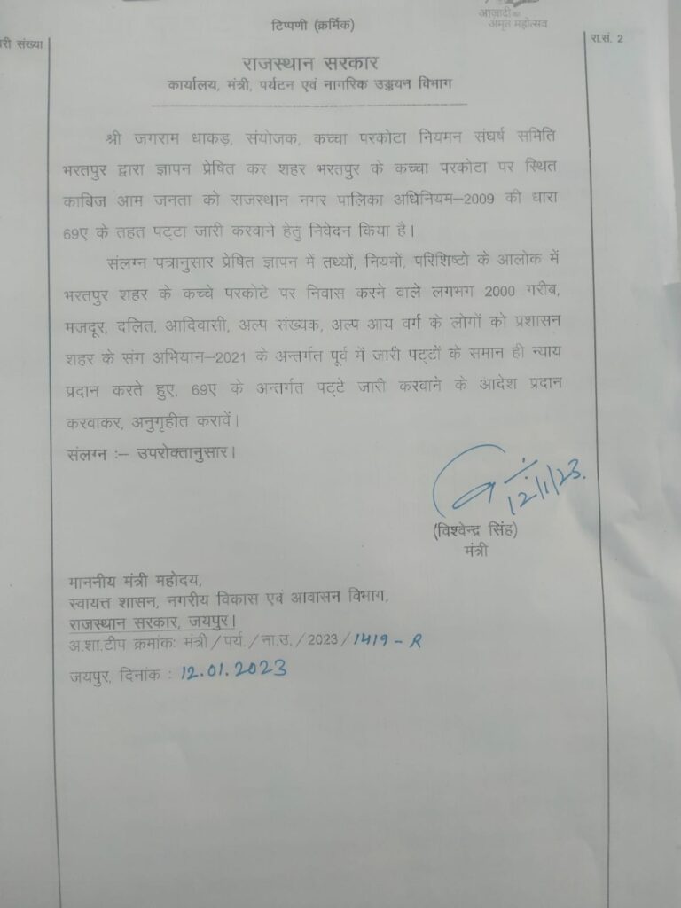स्वायत्त शासन मंत्री शांति धारीवाल को भेजी डिजायर में विश्वेन्द्र सिंह ने कच्चा परकोटा नियमन संघर्ष समिति के संयोजक जगराम धाकड़ द्वारा दिए गए ज्ञापन का जिक्र करते हुए आग्रह किया गया है कि कच्चा परकोटा पर काबिज लोगों को प्रशासन शहरों के संग अभियान 2021 में राजस्थान नगर पालिका अधिनियम-2009 की धारा 69 ए के तहत पट्टे जारी किए जाएं।
