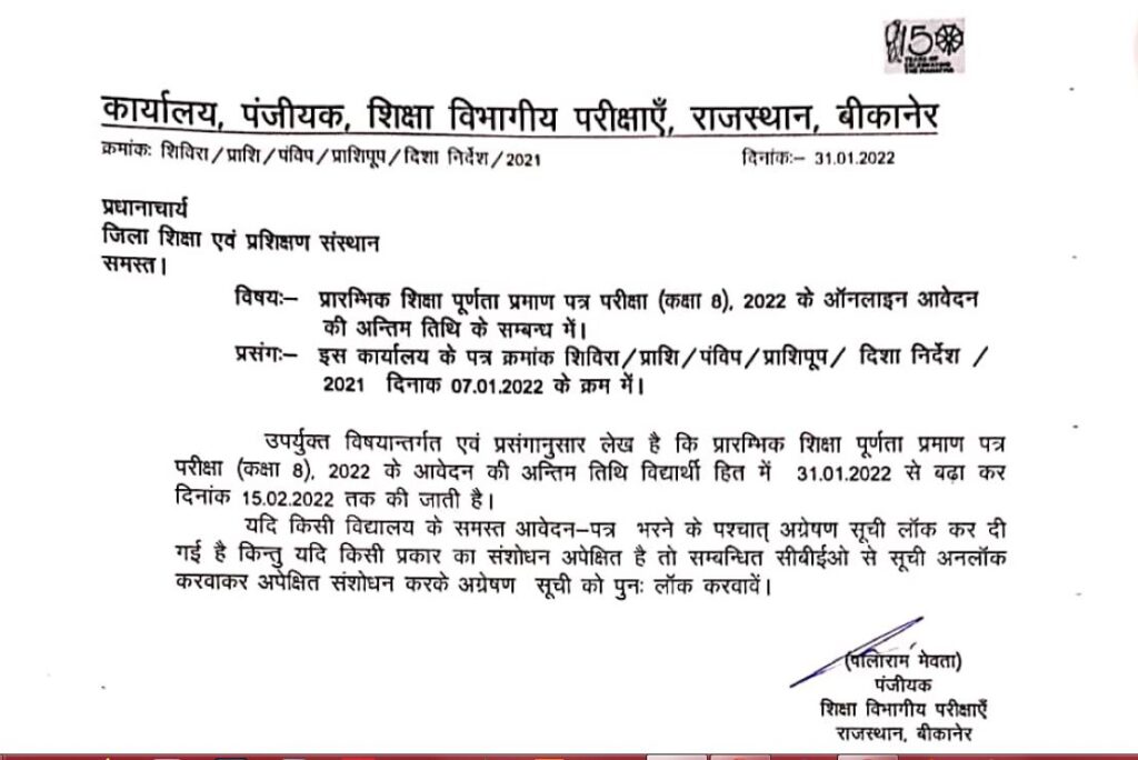 8वीं बोर्ड परीक्षा के ऑनलाइन आवेदन की लास्ट डेट बढ़ाकर कर अब 15 फरवरी कर दी गई है। रविवार 31जनवरी आवेदन की लास्ट डेट थी, लेकिन इस दिन तक में करीब डेढ़ लाख स्टूडेंट्स आवेदन नहीं कर पाए थे। इस पर विभाग ने आज इसकी अंतिम तारीख 31 जनवरी से बढ़ा कर 15 फरवरी कर दी है।