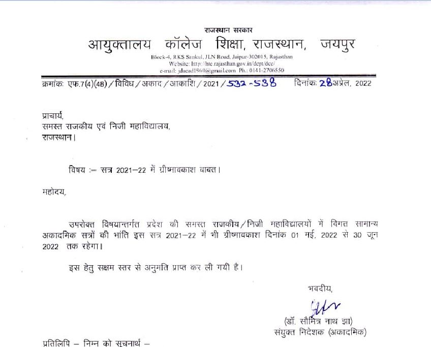 राजस्थान के कॉलेजों में आखिर ग्रीष्मावकाश के आदेश गुरुवार को जारी हो गए। कॉलेज आयुक्तालय के संयुक्त निदेशक (अकादमिक) डा. सौमित्र नाथ झा की ओर से यह जानकारी दी गई।